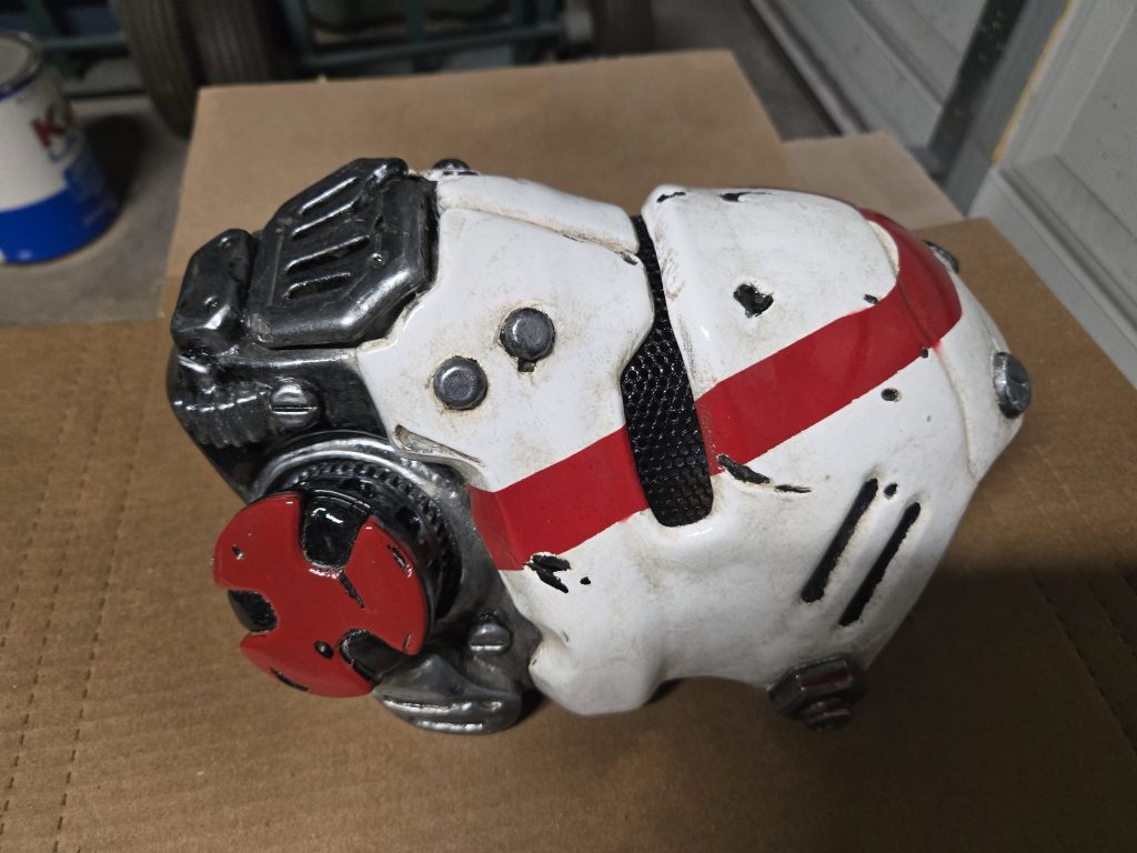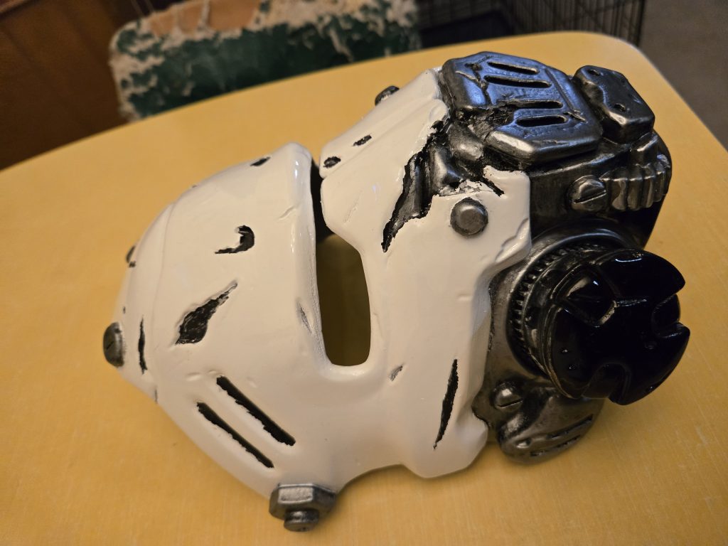 Next I hit it with some gloss black paint canned spray paint. Tapped up the parts I wanted to stay black and then hit it with some glossy white spray paint. Finished that up with some Vallejo metallic silver and chain-mail paints for the metal highlights.